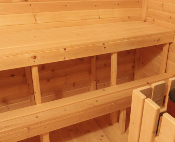 Двухуровневый полок г-образной формы может быть установлен только при боковой установке печи как с внешней загрузкой (улица, раздевалка, моечная), так и с внутренней загрузкой в парной.